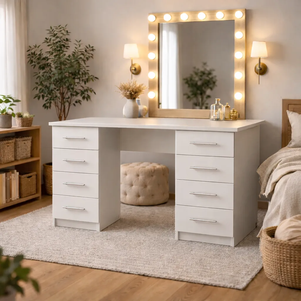 Elevate your room with this modern 8-drawer UK-made vanity desk, designed to offer both style and exceptional practicality. Crafted with clean, contemporary lines and a smooth matte finish, it provides a spacious tabletop perfect for beauty routines, work, or everyday organization. The eight smooth-glide drawers offer generous storage for cosmetics, hair tools, accessories, or office essentials, keeping your space tidy and clutter-free. Built with durable UK craftsmanship, this vanity desk delivers long-lasting quality and a refined look suited to bedrooms, dressing rooms, or studio spaces. A perfect blend of functionality and modern design.