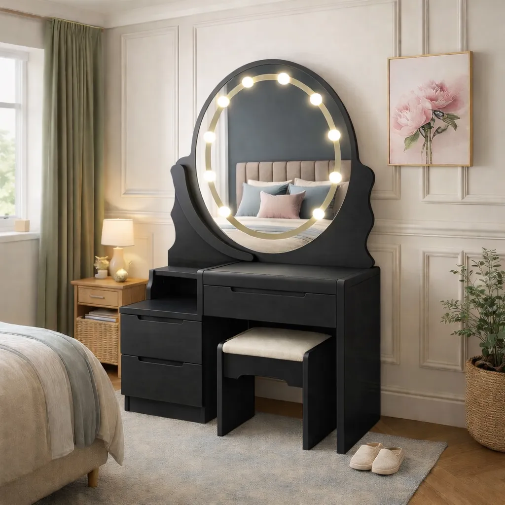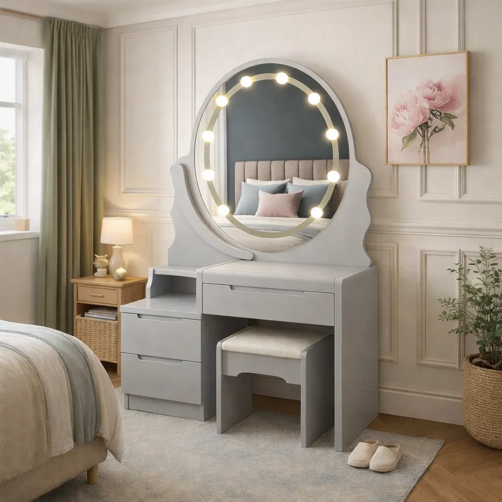 Modern White Makeup Table with Light Bulb Mirror – UK