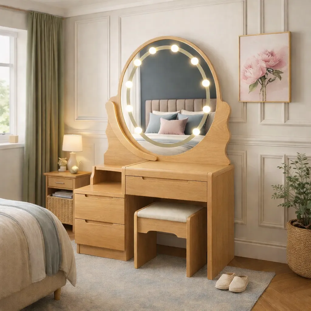 At the center of this elegant setup is the light bulb mirror, inspired by professional Hollywood-style vanities. The evenly spaced bulbs provide clear, shadow-free illumination, helping you achieve flawless makeup, skincare, and styling results—whether it’s day or night. The warm yet balanced lighting ensures accurate color visibility, making it ideal for detailed beauty work.