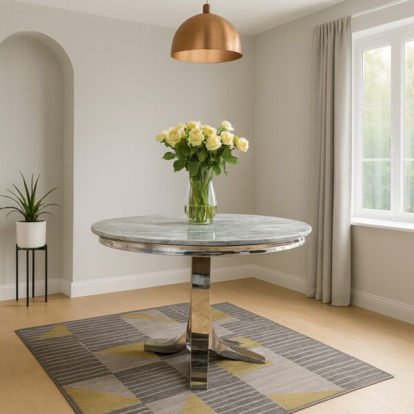 Supported by a sturdy, chrome-finished base, the table is not only visually stunning but also built to last. Its sleek, minimalist lines make it a versatile centerpiece that complements both contemporary and classic interiors. Whether placed in a formal dining room or a stylish kitchen nook, this marble table enhances your space with effortless charm.