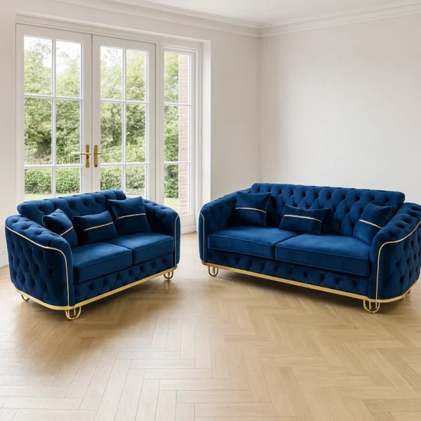 3+2 Madrid Sofa Set – Handmade in UK The 3+2 Madrid Sofa Set is the ultimate statement piece, blending luxury craftsmanship with modern elegance. Upholstered in sumptuous plush velvet and finished with striking gold steel detailing, it transforms any living room into a stylish retreat. Expertly handcrafted in the UK, this sofa set combines deep-button…